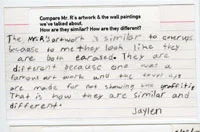 "The Mr. R's artwork is similar to cover ups because to me they look like they were both erased. They are different because one was a famous art work and the cover ups are made for not showing the graffiti. That is how they are similar and different." –Jaylen
